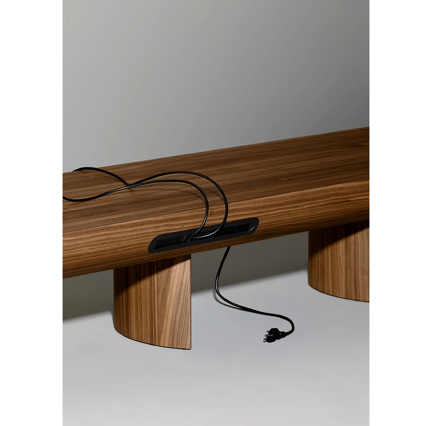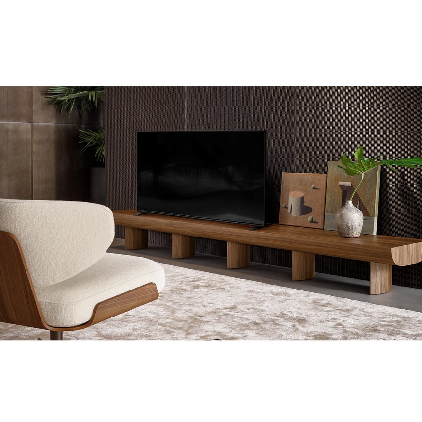 Designed by Alain Gilles, this TV stand is a piece with considerable impact even though it has a simple and linear design. Sculptural appears as a single wooden element supported by five legs which form the base. The surface develops in a downward arc while it has a cavity in the rear which is useful for concealing cables, thereby ensuring the maximum in aesthetic performance. Whether used as a TV stand or a design TV console, placed against a wall under the TV or in the living room in front of a sofa, Sculptural genuinely resembles a sculpture and this is the true stylistic hallmark of this design.