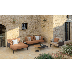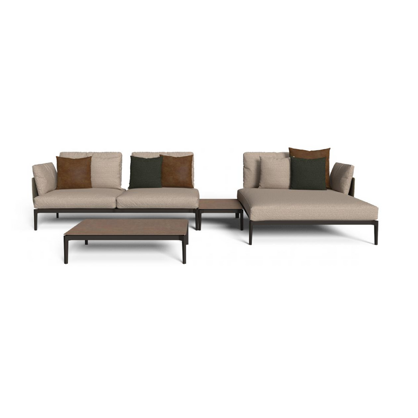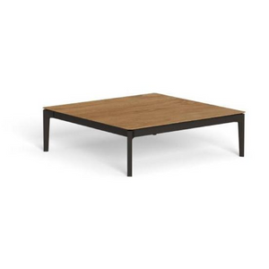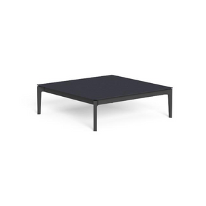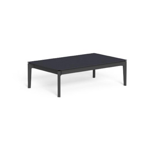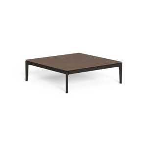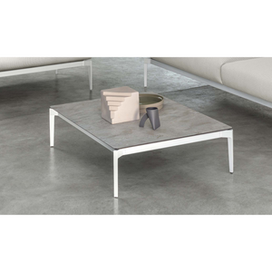 The Leaf coffee table is the smallest of the collection. The aluminium frame combined with the vitter top has been inspired by the light and suspended lines characterizing the sofa, the chair and the armchair. The coffee table of the Leaf collection has compact dimensions with an elegant and functional design, suitable for a natural environment.