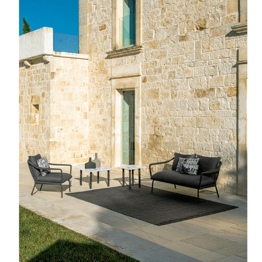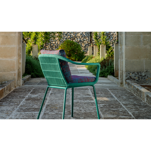 The soft and embracing shape of the Dining Armchair of the Cruise Alu Collection makes the product perfect to furnish your garden. The aluminum structure supports the body perfectly wrapped by the quick dry foam cushions. The fabric, resistant to weather conditions, goes along with the synthetic ropes which envelope the backrest and the armrests making the armchair the ideal furniture for outdoor.