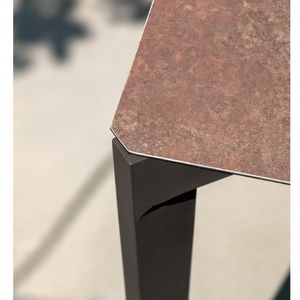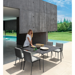 The dining table of the Leaf collection can seat up to 8 people. Its aluminium frame and vitter top reflect the elegance and the design on which characterize the entire Leaf collection.