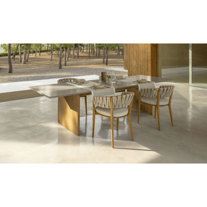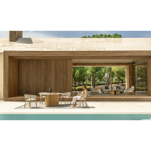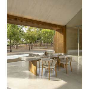 The Venice dining armchair, inspired by the famous lagoon city, is the perfect solution to enhance your living area in the garden. The solid teak wood frame embraces the wide and comfortable seat. The fabric of the cushions and the rope weave that wraps around the back, recall the classic nautical style and make the exterior refined and elegant.