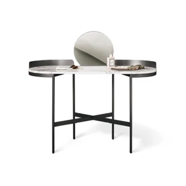 The Asia model is a multifunctional piece of furniture. It can turn from a desk into a vanity table with the addition of a mirror. The top features only rounded lines, and it is available in either marble or ceramic, while the structure base is made of metal. The idea behind the modern writing desk is a blend of form and function, a stylistic sophistication expressed through a daily commitment to harmony.