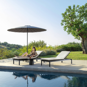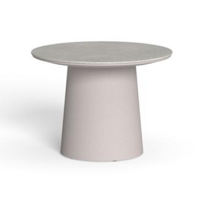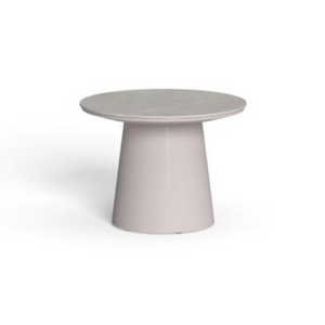 The aluminum coffee table stands out for its minimalist and contemporary design. The conical base supports a round stoneware top, creating an aesthetic that integrates perfectly into any outdoor environment.
