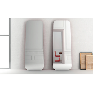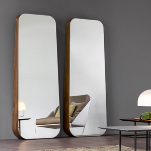 Obel is an important standing frameless wall mirror that, thanks to its large reflective surface, allows the individual to play the starring role. The trapezoidal shape, consisting of a thin structure with blunt contours, has a wider thickness at the base and a narrower one at the top, giving movement to the whole. The wooden structure, which gives the vertical mirror volume and richness, is available in American walnut. Obel’s conspicuous size, as well as the rounded and sinuous profile, ensures a spectacular result of great impact. Its pure and slender monolithic presence is able to expand and decorate any space with lightness and sophistication: this is when functionality is in perfect agreement with beauty.