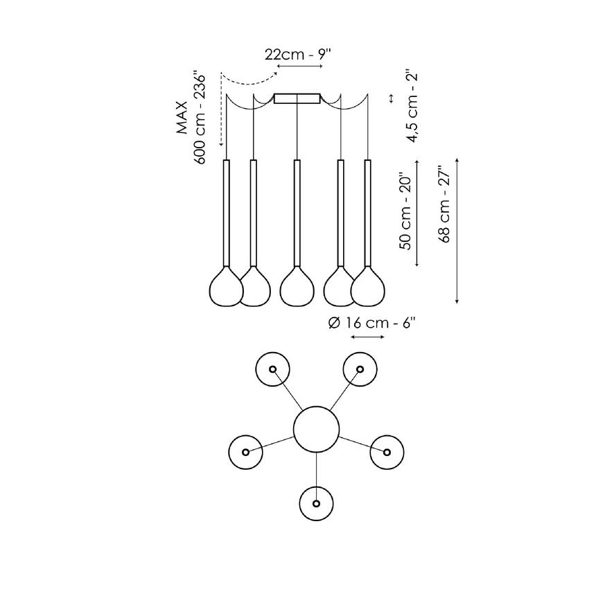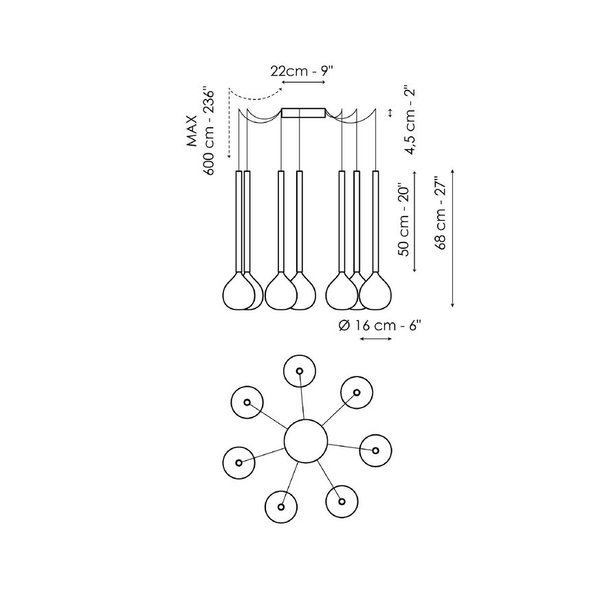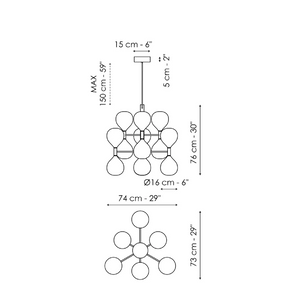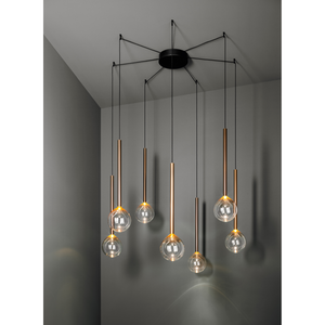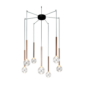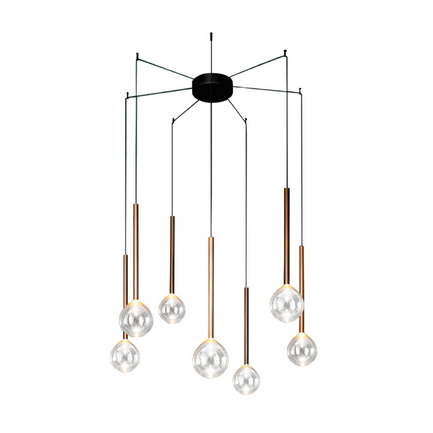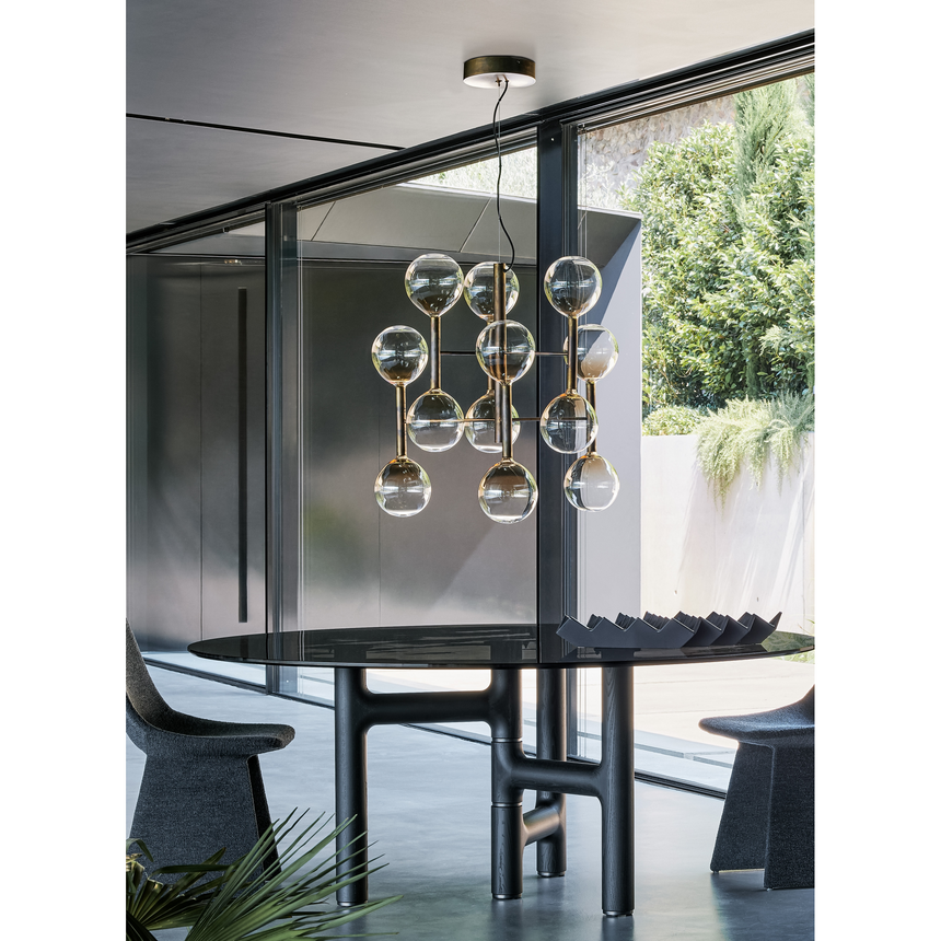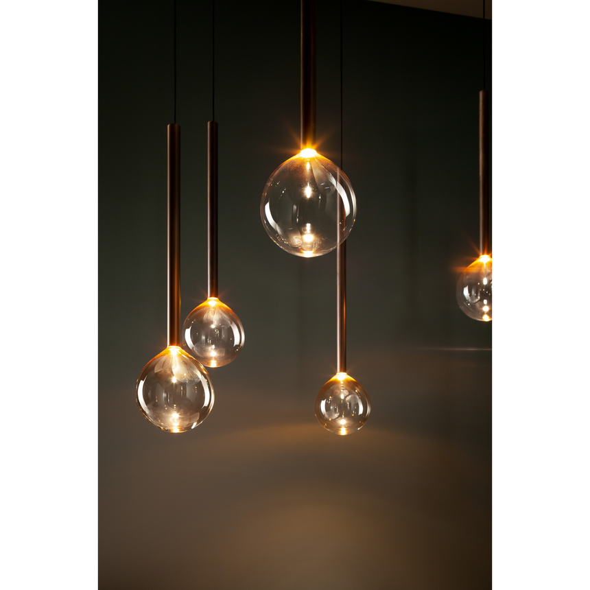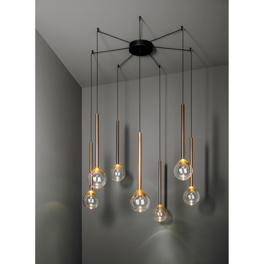 The primary shape of the Sofi collection, designed by Studio Team Design, is the borosilicate glass globe with a warm amber finish, which is combined with a burnished brass cylinder that contains the light source and brings to mind the image of master glass-blowers who, in their Venetian workshops, use their long blowpipes to craft the incandescent molten glass with great skill. The Sofi pendant design lamp makes it possible to create coordinated environments, thanks to its availability in a wide range of models: the ceiling lamp with a metal frame with 7 or 10 lights, the suspension with 1, 5 7 or 13 globes, the floor lamp, two versions of the table lamp (lower without a glass globe, or higher with a glass globe) and the wall lamp, distinguished by the double direction of the light flux.