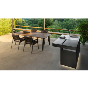 The Cottage dining table combines the country and the minimalist style. The top, realized in iroko wood, is supported by a solid aluminum structure. The linear shape of the top is combined with the irregular one of the legs, creating a large table which can accommodate up to 10 guests.