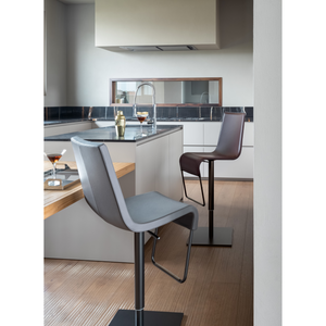 Skipping is a swivel stool with backrest that offers an adjustable height thanks to a robust piston mechanism. Available with upholstery in eco-leather, leather or emery-leather, it is particularly comfortable thanks to the sinuous shapes of the seat, with cold foamed polyurethane padding. The structure and the footrest are made of matt painted metal or chrome-plated steel. With its understated, curvilinear but minimalist line and design by Karim Rashid, Skipping is welcoming and comfortable and integrates perfectly within original environments, characterized by sophisticated atmospheres. A flexible, extremely pure and contemporary sign: an original and fascinating object that as the dominant character in any space with its agile and dynamic presence, appears comfortable and inviting right from the first glance.