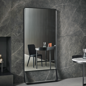 The rectangular shape and the rounded corners are the main characteristics of the Narciso mirrors, available in two different sizes. The profile, a metal frame available in different finishes, is transformed in the bottom section, widening towards the support base, thus creating an empty space between the modern floor mirror and the base. The frame is available in anthracite grey , black and supreme anthracite metal or in bronze, pearl gold and lead metal finishes.
