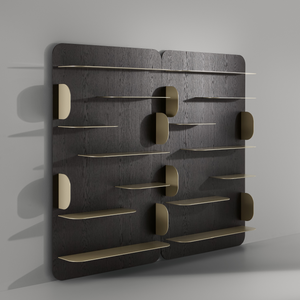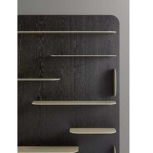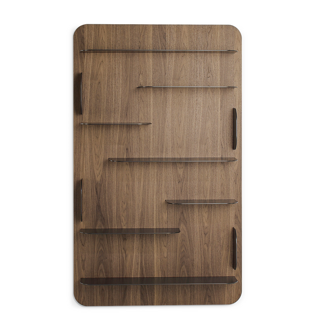 The Blabla collection consists of two different functional units, a contemporary design bookcase panel and a mirror panel, which when paired together create a system of elements that can be individually positioned or combined in an elegant composition. The distinguishing feature of the Blabla contemporary bookcase and mirror is the rounded profile of the shelves and side support panel, as well as the interruption and discontinuity of the shelves. The Blabla collection consists of a thick panel in Canaletto walnut or coal ash wood, contrasting with slender metal shelves; the bookcase is wall-hung and comes with shelves of various lengths.