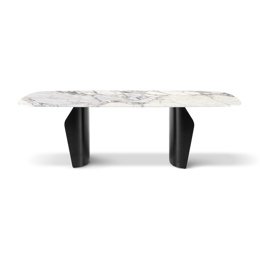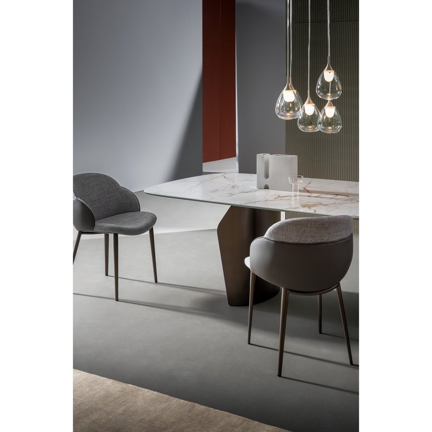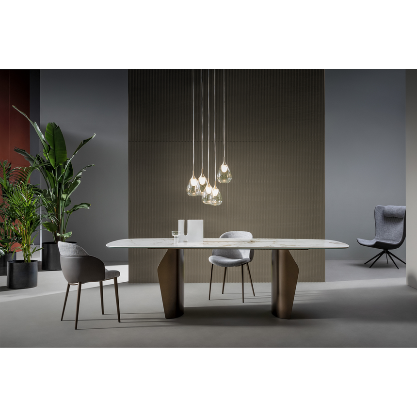 Flame’s main features are its harmonious shapes and light, sinuous volumes. The top, which is visibly suspended, is fully usable thanks to the position of the double base designed to optimize the overall space. Form and function are perfectly expressed in this table: the extensive customization options allow you to arrange it according to your tastes, needs and the mood of the surrounding space. The top is available in a number of sophisticated finishes – from wood to ceramic and marble – and you can choose from various metal options for the base. A wooden base is also available for this modern living room table (Flame Wood).