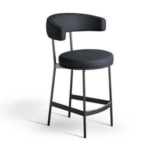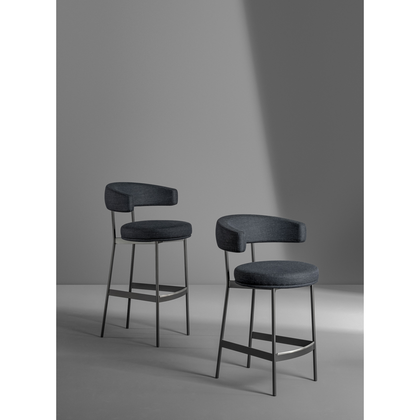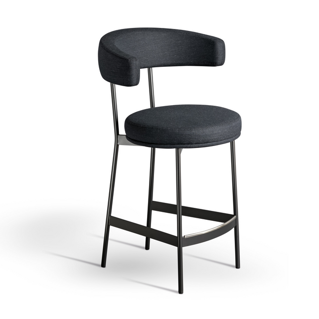 Neuilly too stands out for its delicate image and unique formal qualities which combine the geometric purity of the classic stool with a level of comfort that is evident at first glance. The slender proportions of the linear metal frame further highlight the circular padded seat while at the same time the ergonomic profile of the welcoming backrest/armrest offers a natural seating position and guarantees the stool great ease of use both in bar spaces and facing counters in dining areas.
