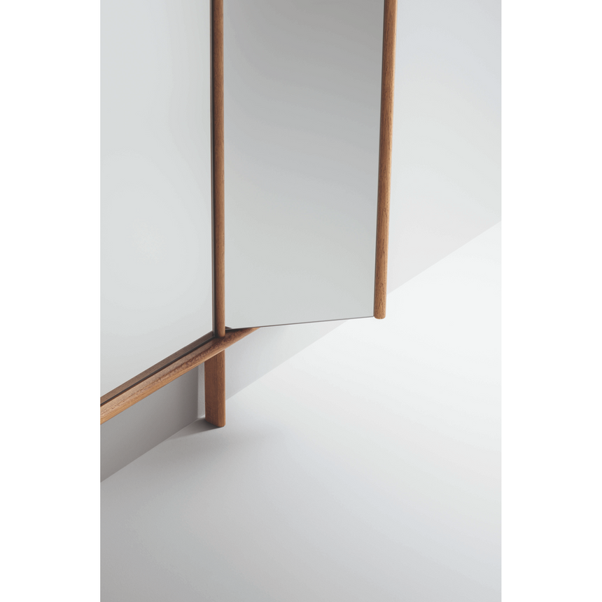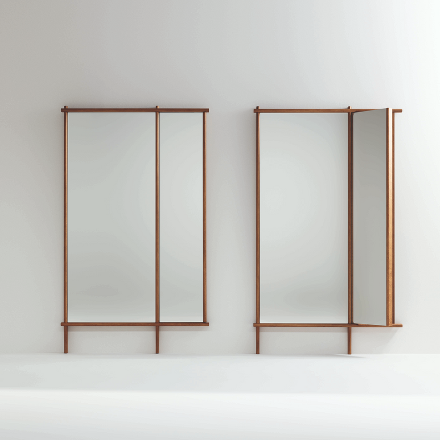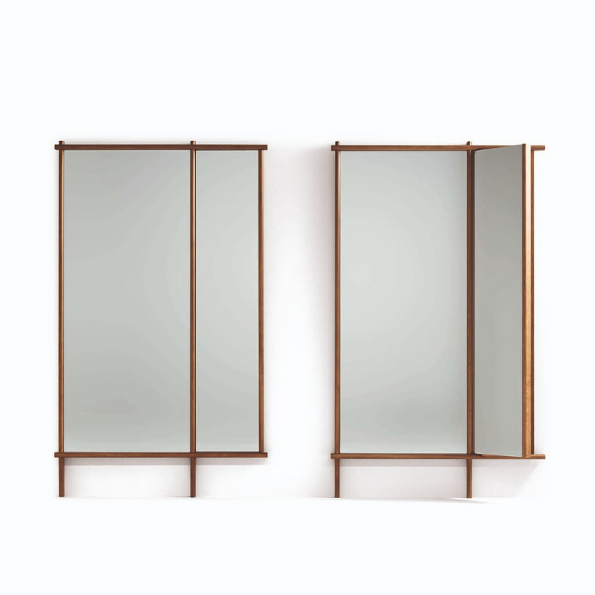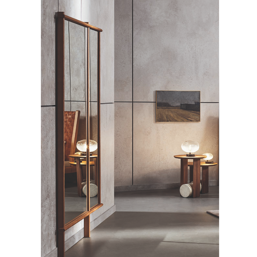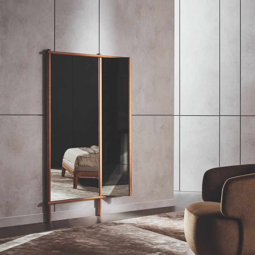 The freedom to reflect at ease, tilting a part of the mirror to reflect images from every perspective and visualize every little detail. This is the idea behind Isola, a mirror surrounded and supported by solid wood profiles with an oval section and a moveable flag wing. The value of the asymmetric frame in American walnut lies in its lack of balance: the mobile part is in fact what makes the mirror more functional, making this complement ideal for the sleeping area, but also for other rooms of the house such as entrances , corridors or walk-in closets.