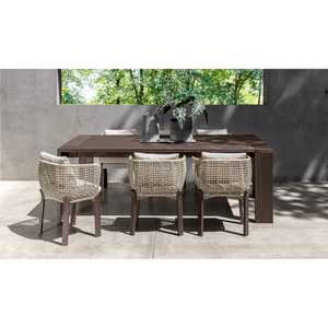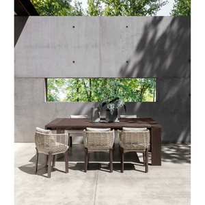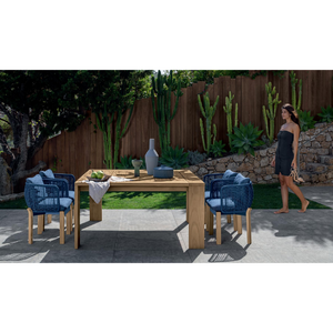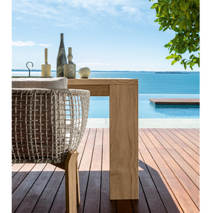 The combination between highly selected raw wooden materials and the Accoya working make this table the best choice to decorate an elegant and high- quality outdoor dining space. The geometric and rigorous style of the entire collection is reproduced in this piece of furniture which becomes the key element to combine your outdoor furniture in a variety of styles. This concept is highlighted by the style of the table top, made up of wooden slats, and the angled legs. Depending on the chosen colour combination, it can appear more or refined or materic but it is always an excellent product to decorate your outdoor space.