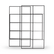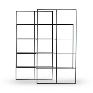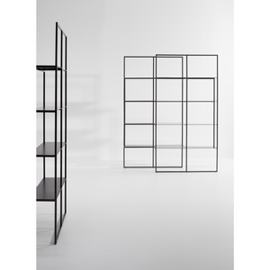 Like in a dance, the Optic’s two supporting frames perfectly slide together to create a spacious system of staggered shelves: the metal bookcase shelves are wider in the middle to accommodate large objects, while the side shelves are lighter and cantilevered. The shifted frames give the bookcase a striking 3D effect and permit different configurations in the space: side by side on the wall, overlapping or in the center of the room joined with an “L” arrangement as a partition within the room.