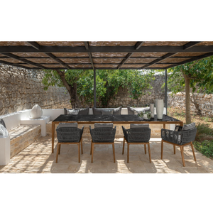 The dining chair of the Cruise teak collection is linear in shapes but never banal. The comfortable and high seat, realized in quick dry foam, is covered with weatherproof fabric. The wood of the base and the ropes used to cover the backrest and the armrests make the product in line with the concept of the collection.