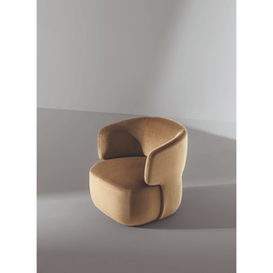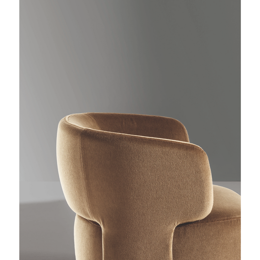 The name of the family of armchairs is inspired by the figure of the Doge, the head of government at the time of the Venetian “La Serenissima” Republic. The presence of two flaps that wrap around the seat starting from the armrest are reminiscent of the Doge's headgear, giving the armchair’s shape a sense of distinction and authority. The evocation of a 1970s aesthetic, together with an explicit sense of modernity in concept and material, puts the Doge in a world where elegance and simplicity of design reign supreme. The Doge armchair is available in three models. The armchair with upholstered base imbues the configuration with a sense of compactness and balance in proportions and offers a sense of comfort from the first glance every time it is used. The other two variants are light and raised: the one is more modernist, with a central four-legged base and swivel mechanism while the other has striking solid wood legs. The three different versions convey an immediate personal confidentiality in their appearance, revealing themselves to be casual yet elegant both in residential furnishings and in the world of hospitality.