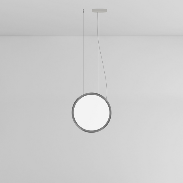 Discovery is a family of appliances available in 3 diameters: Ø70, Ø100 and Ø140cm based on minimal geometry. Discovery Vertical Suspension is a seemingly unobtrusive, utterly absent and immaterial element. A very light aluminum ring houses an LED strip that injects light into a specially worked surface with micro particles so small that the surface is hardly perceptible when the appliance is turned off.
