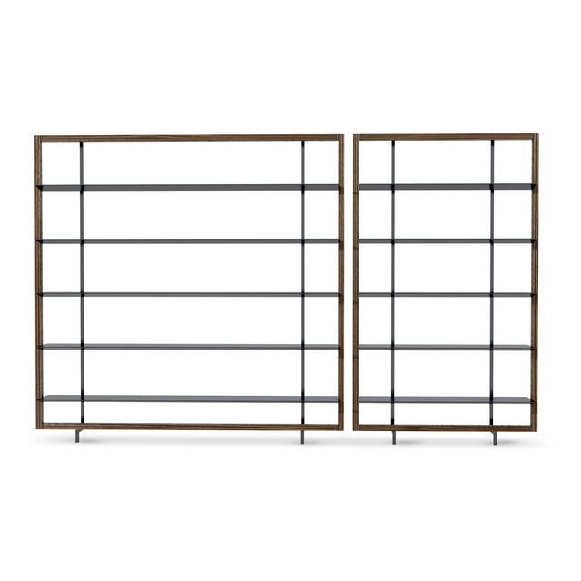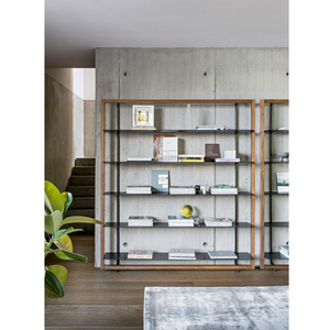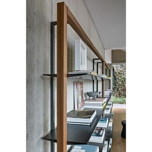With its wooden frame protruding from the wall-mounted metal structure, the Alix lightweight bookcase furnishes the wall by breaking its monotony. The careful choice of materials is at the core of this project, consisting of simple and linear shapes: the concept is strengthened by the use of aluminum, a cold and tenacious material that makes the structure optically light, combined with the warmth of the wood, the real star of Alix’s design.