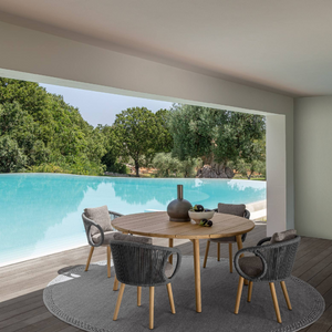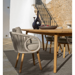 The Karen dining chair recalls the typical beauty of African lands. The design is characterized by the ring armrests and the back that wraps gracefully around the seat, evoking the royalty of a throne. The interweaving of countless threads of fabric reveals the craftsmanship of the chair, which is as welcoming as a refuge, making the outdoor environment rich in style and personality.
