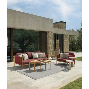 Ideal for a relaxing area, the Dolcevita living armchair exudes the lightheartedness of summer evenings. Armrests and backrest are characterized by a dense weave of strings that highlights the texture of the wood. This piece of furniture fits in outdoor environments giving a touch of freshness and easily adapts to different styles thanks to the multiple colors in which it is available.
