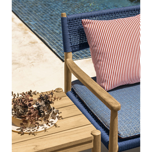 Ideal for a relaxing area, the Dolcevita living armchair exudes the lightheartedness of summer evenings. Armrests and backrest are characterized by a dense weave of strings that highlights the texture of the wood. This piece of furniture fits in outdoor environments giving a touch of freshness and easily adapts to different styles thanks to the multiple colors in which it is available.