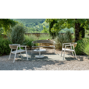 The Key collection sofa cleverly combines the lightness of the materials with the lightness of the shapes. The structure, in aluminum, supports the body thanks to a cushions made of textilene, supported by the typical weaving of synthetic ropes of the collection.