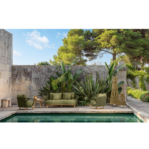 The Karen daybed gives the outdoor environment an intimate and reassuring atmosphere, thanks to the African-inspired design that recalls the appearance of a protective cocoon. The craftsmanship of the back, supported by countless threads that are intertwined with the armrests rings, gives rise to a meeting between cultures. The curved and enveloping lines of the upholstery and the fabrics of the cushions radiate the unique beauty of African lands.