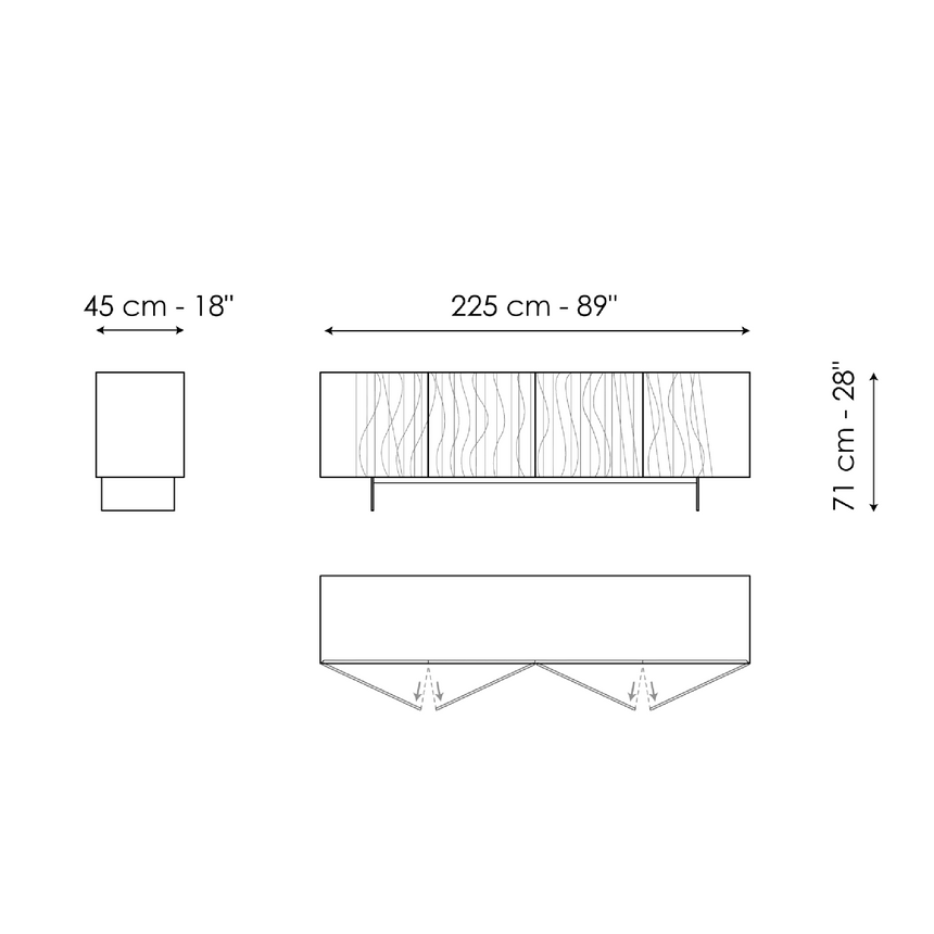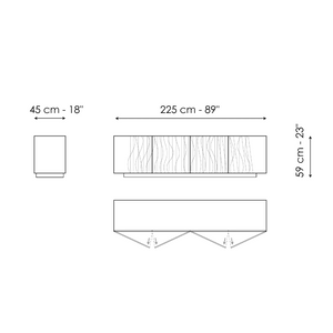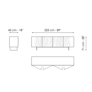 Essential in its form and appearance which are emphasized by the design of the double blade base, the Blush modern wood sideboard surprises observers thanks to the style of the front section, marked by furrowed traces in slight relief that give the appearance of “vibrating”. The straight and curved lines of the abstract pattern, which follow one another in a variable rhythm, both mirror and at the same time emphasize the natural grain of the wood, enhancing the different tonal nuances and the chiaroscuro depths in a perceptive “trick” revealed by the name of the accessory: this decoration is a subtle aesthetic tool that causes the sideboard to appear dark red in color.
