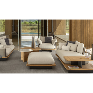 Ideal for a relaxing area, the Venice living armchair offers maximum comfort thanks to a wide seat and soft cushions. Armrests and backrest are enriched by elegant textures that recall the nautical style. This piece of furniture fits gracefully into the outdoor environment, by virtue of its floating design. The solid teak wood base and accoya, gives the illusion of emerging as a boat on a watercourse, creating an effect that conveys charm and lightness.