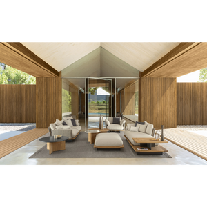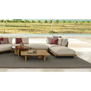 The pouf from the Venice collection makes the external environment more comfortable. The cushion with its soft shapes, lies lightly on the solid wooden base, which seems to float thanks to the originality of its design. A practical piece of furniture that completes the outdoor living room and garden with elegance.