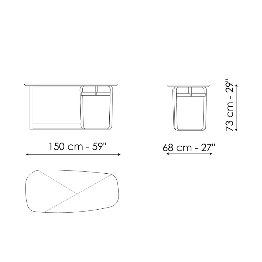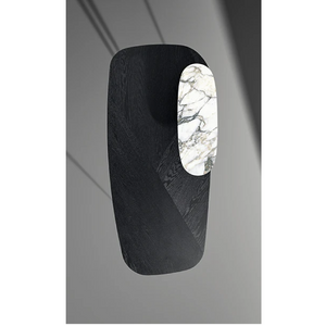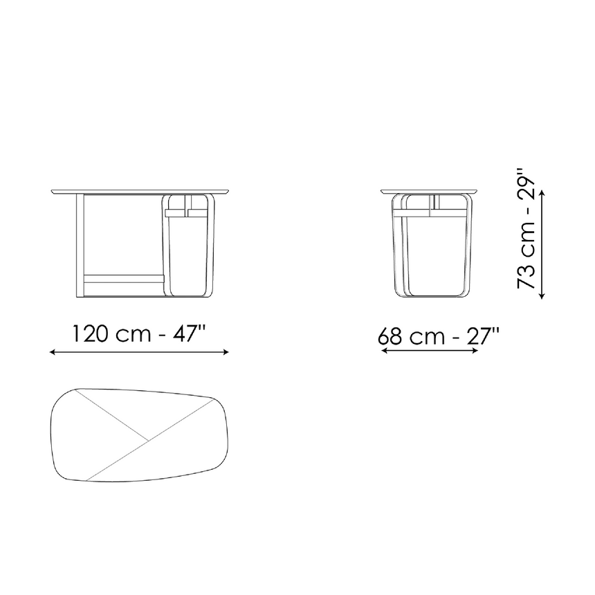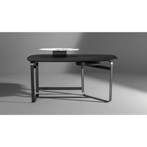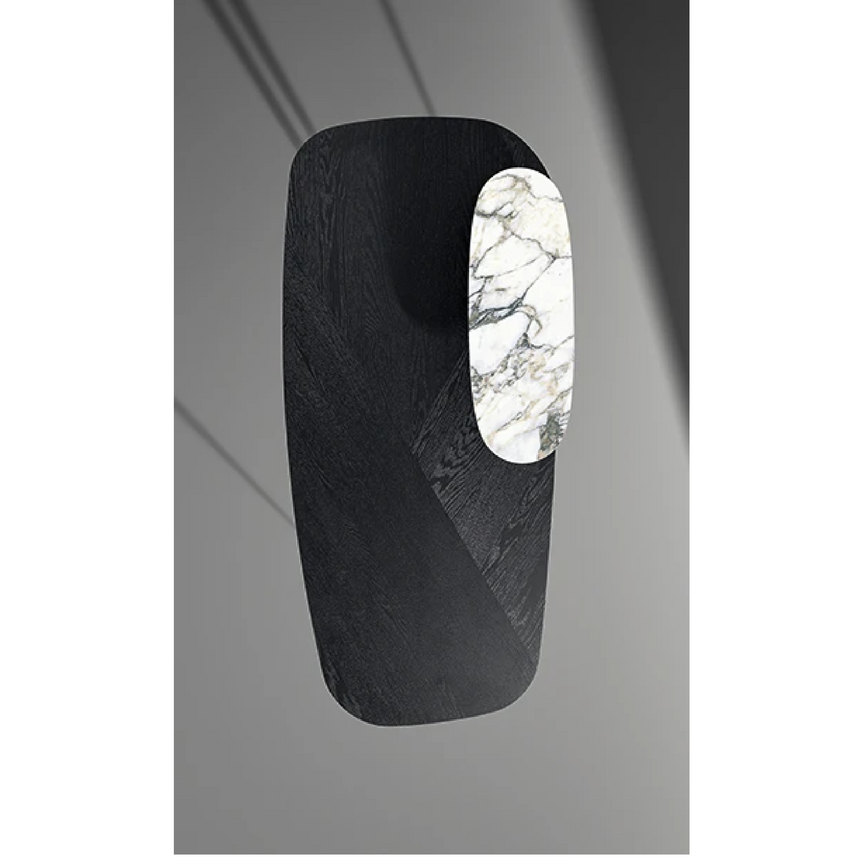 The Gauss modern wood writing desk features a curved, fluid top with no sharp edges, much like the legs, which take on the appearance of metal rings with rounded corners. The distinguishing feature of Gauss is the raised section, which creates a second level for the desk. In addition to the main desk top in wood, Gauss also offers a practical “floating” shelf made from ceramics, which is attached to the main desk via two metal bars. Gauss’s other unique detail is the shape of the legs, which stand in a dynamic, asymmetrical position, creating an irregular structure which lends a youthful, casual quality to the desk. In addition, the veining in the wood of the desk top adds dynamism, increasing the desk’s aesthetic impact. One possibility for customization is the addition of a concealed round drawer in painted metal.