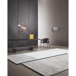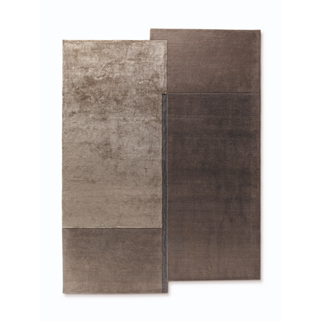The Rabat rug is inspired by abstractionist artistic currents, in which geometry and variable compositions are the distinctive features. The rug combines different finishes, shades and shapes that emphasize its rigour and aesthetic research. An almost interrupted central profile, made of darker Tencel, vertically divides the carpet into two non-identical parts. Furthermore, the combination of different materials such as wool and Tencel underline a dynamism that contrasts with the geometric rigour of its shape, creating levels that are staggered but still in perfect harmony with each other. The Rabat rug furnishes any living and dining space in a welcoming style but can also be used in the sleeping area.