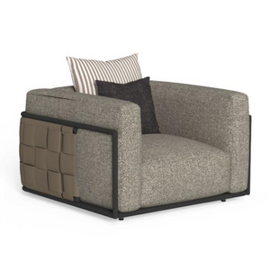 From the study of the cube as a primordial form, comes the sophisticated design of the Tressè armchair. The woven eco-leather bands that embrace the perimeter of the seat are the distinctive feature of this piece of furniture, which conveys a reassuring feeling of comfort and solidity. The soft and imposing cushions are highlighted by the fine finishes and the tubular aluminum structure. Available in silk gray, mud and Sienna, this armchair is the ideal outdoor solution for your garden or outdoor living room.