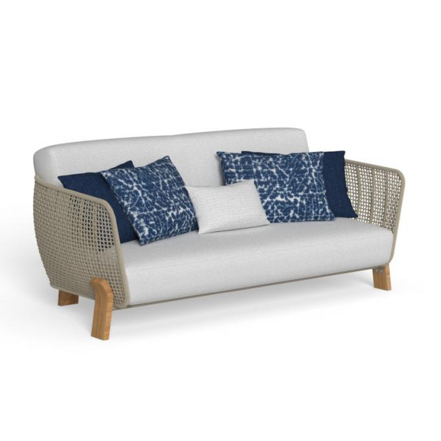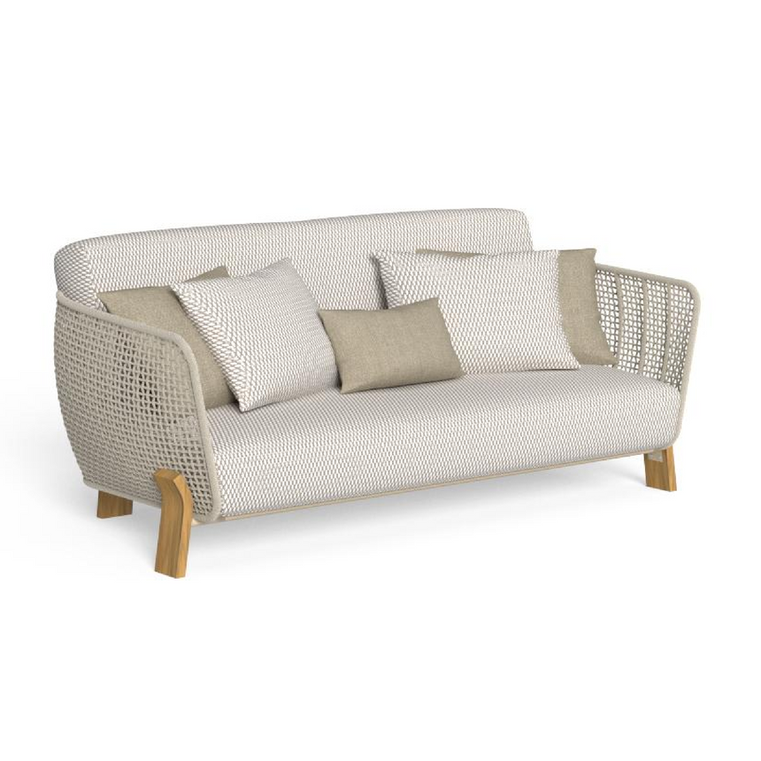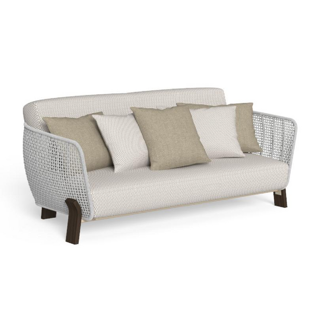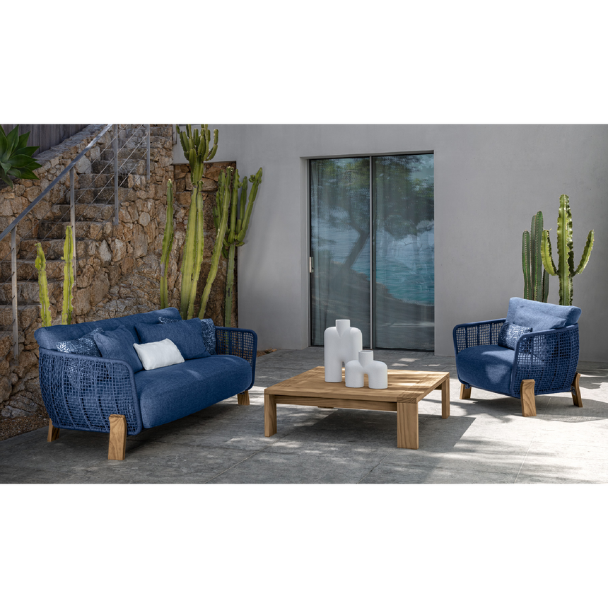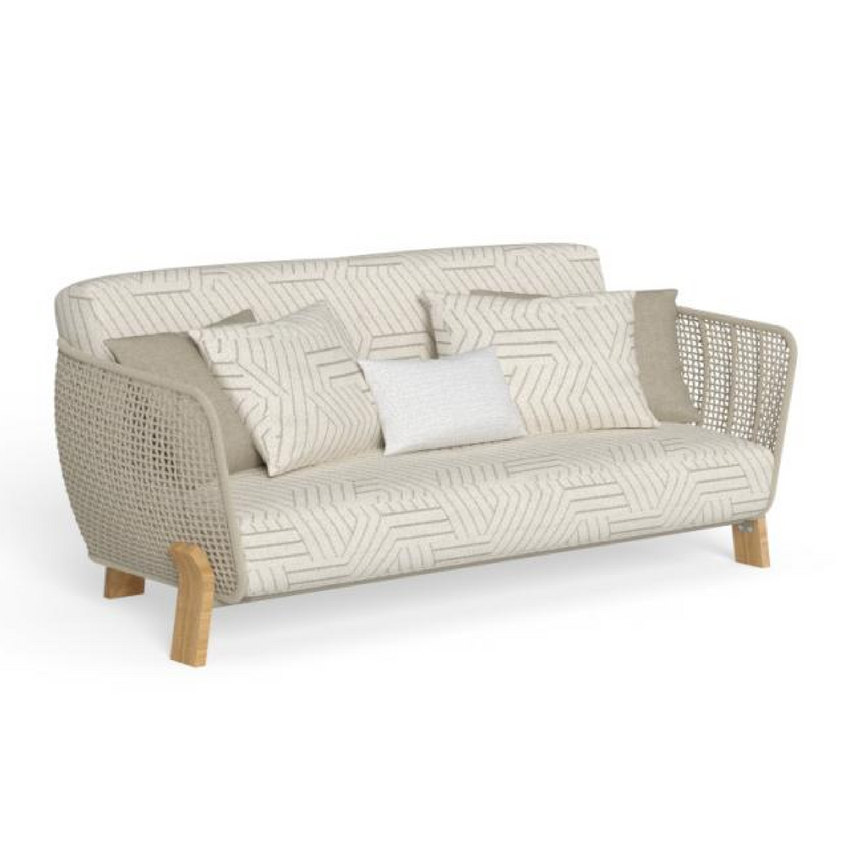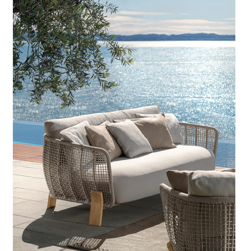 Sinuous lines in the armrests and geometric shapes in the seats flow together into the Argo love seat sofa, perfect to enjoy a relaxing moment in your leisure time. The curved wooden feet, externally fixed, are the key element of this sofa. The armrests and the wide backrest, made up of nautical woven ropes, create a refined play between material and volume, in line with the style of the whole collection. The quick dry foam padding of the cushions, along with the weather- resistant fabrics, allow you to decorate your outdoor area in a functional way.